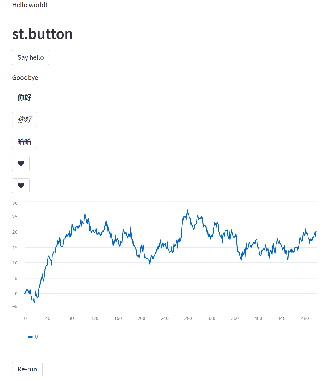 1 2 3 4 5 6 7 8 9 10 11 12 13 14 15 16 17 18 19 20 21 22 23 24 25 26 27 28 29 30 31 32 33 34 35 36 37 38 39 40 41 42 43 44 45 46 import streamlit as stimport numpy as npimport timest.write('Hello world!' ) st.header('st.button' ) if st.button('Say hello' ): st.write('Why hello there' ) else : st.write('Goodbye' ) st.button('**你好**' ) st.button('*你好*' ) st.button('~哈哈~' ) st.button('❤' ) st.button('❤' , key='1' , help ='This is a heart emoji button' ) def plotting_demo (): progress_bar = st.sidebar.progress(0 ) status_text = st.sidebar.empty() last_rows = np.random.randn(1 , 1 ) chart = st.line_chart(last_rows) for i in range (1 , 101 ): new_rows = last_rows[-1 , :] + np.random.randn(5 , 1 ).cumsum(axis=0 ) status_text.text("%i%% Complete" % i) chart.add_rows(new_rows) progress_bar.progress(i) last_rows = new_rows time.sleep(0.05 ) progress_bar.empty() st.button("Re-run" ) plotting_demo()