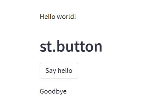 1 2 3 4 5 6 7 8 9 10 11 import streamlit as stst.write('Hello world!' ) st.header('st.button' ) if st.button('Say hello' ): st.write('Why hello there' ) else : st.write('Goodbye' )