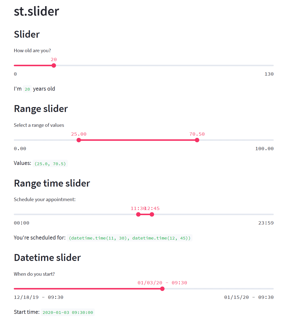 1 2 3 4 5 6 7 8 9 10 11 12 13 14 15 16 17 18 19 20 21 22 23 24 25 26 27 28 29 30 31 32 33 34 35 36 37 38 39 import streamlit as stfrom datetime import time, datetimest.header('st.slider' ) st.subheader('Slider' ) age = st.slider('How old are you?' , 0 , 130 , 25 ) st.write("I'm " , age, 'years old' ) st.subheader('Range slider' ) values = st.slider( 'Select a range of values' , 0.0 , 100.0 , (25.0 , 75.0 )) st.write('Values:' , values) st.subheader('Range time slider' ) appointment = st.slider( "Schedule your appointment:" , value=(time(11 , 30 ), time(12 , 45 ))) st.write("You're scheduled for:" , appointment) st.subheader('Datetime slider' ) start_time = st.slider( "When do you start?" , value=datetime(2020 , 1 , 1 , 9 , 30 ), format ="MM/DD/YY - hh:mm" ) st.write("Start time:" , start_time)