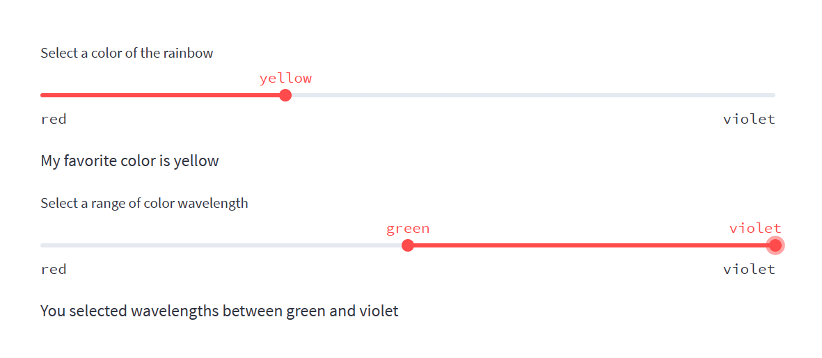 1 2 3 4 5 6 7 8 9 10 11 12 import streamlit as stcolor = st.select_slider( 'Select a color of the rainbow' , options=['red' , 'orange' , 'yellow' , 'green' , 'blue' , 'indigo' , 'violet' ]) st.write('My favorite color is' , color) start_color, end_color = st.select_slider( 'Select a range of color wavelength' , options=['red' , 'orange' , 'yellow' , 'green' , 'blue' , 'indigo' , 'violet' ], value=('red' , 'blue' )) st.write('You selected wavelengths between' , start_color, 'and' , end_color)