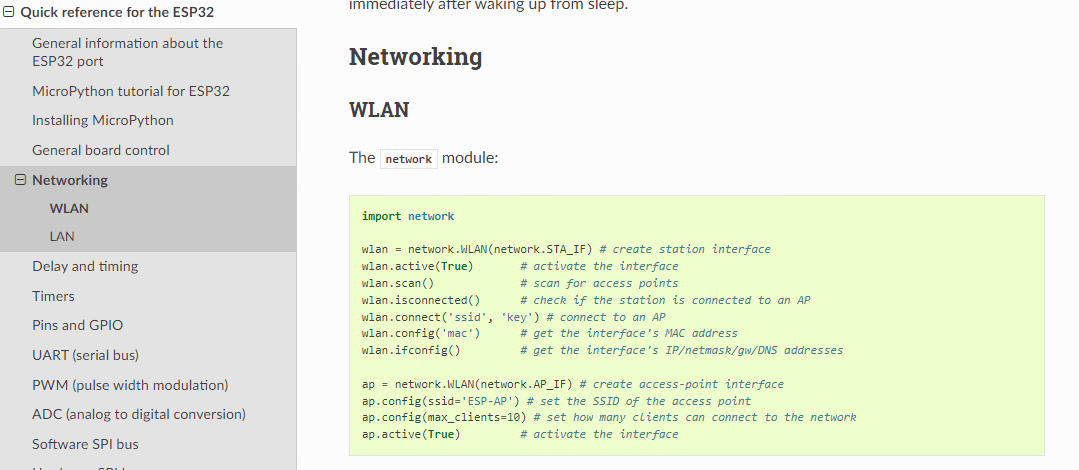 1 2 3 4 5 6 7 8 9 import networkwlan = network.WLAN(network.STA_IF) wlan.active(True ) wlan.scan() wlan.isconnected() wlan.connect('ssid' , 'key' ) wlan.config('mac' ) wlan.ifconfig()