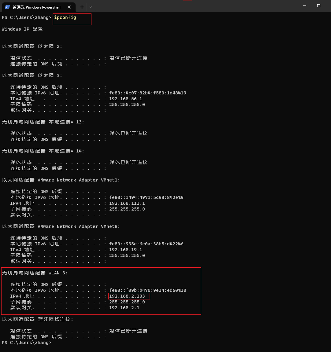然后找一个能保证PC和ESP32都能正常连接的路由器,把电脑连接上路由器,然后在电脑的cmd控制台输入ipconfig,看一下路由器分配的ip地址,如下: