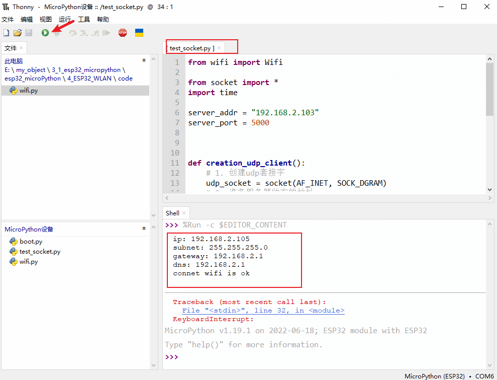 将上面连接wifi的程序封装成wifi.py,然后创建一个test_socket.py文件,这时esp内目录如下: