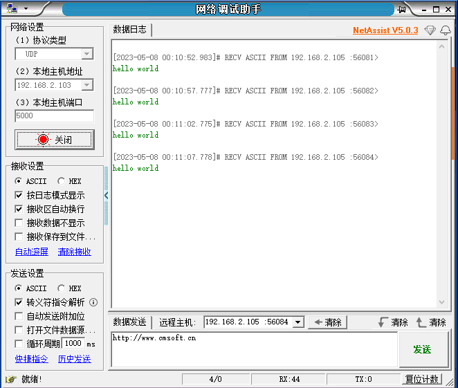 首先将电脑安装一个网络调试助手软件,这里推荐使用NetAssist.exe。下载地址:下载链接 ;