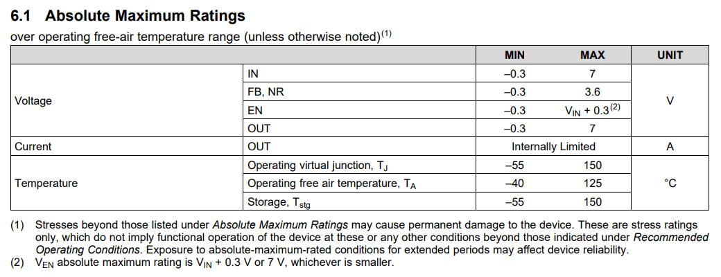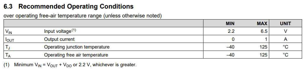 通常说的输入电压是LDO正常工作的输入电压范围,而不是绝对最大电压,可以看到这个LDO的输入电压范围是2.2V - 6.5V。