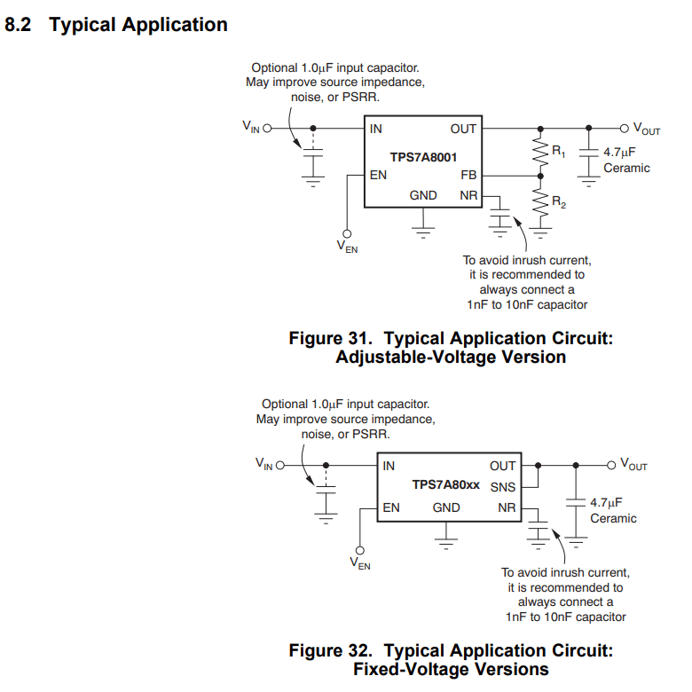 可调输出的版本通过外部反馈电阻,可以将输出电压调整到期望的值。TPS7A8001是可调输出电压。