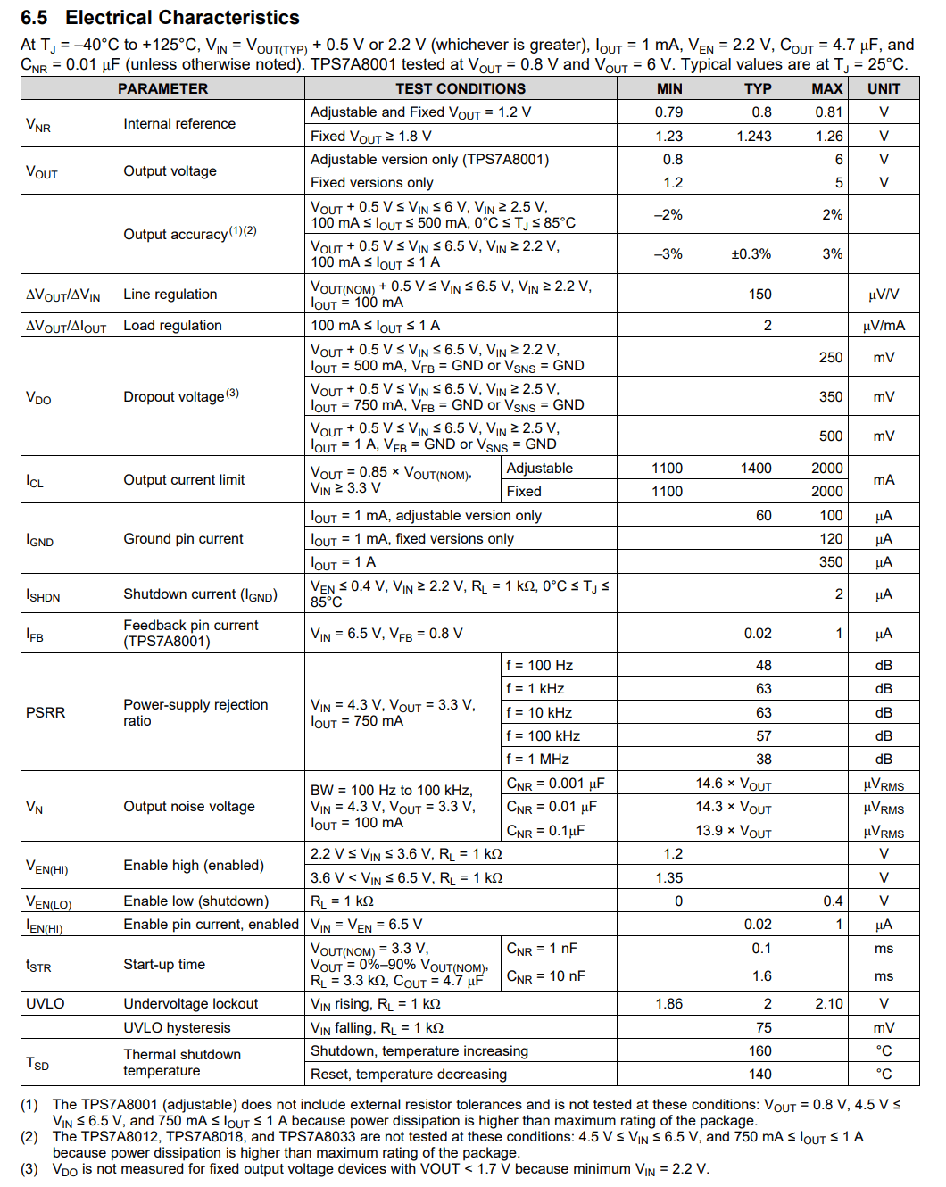 以TI TPS7A80系列LDO为例,看看这些参数在数据表中的表示。