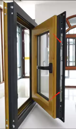 图中箭头所指的就是2个锁点,当窗户锁闭时,这两个锁点与窗框上的两个锁座配合,将窗户锁紧。